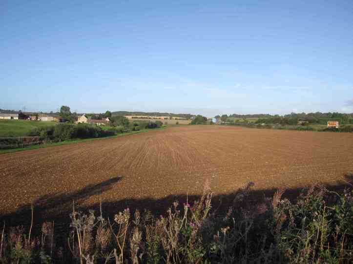 I’ve noted the changing character of the walk, and today it’s clear that I am re-entering more populated areas. The first indicator, ironically, is the low number of gates and stiles in the morning. I’ve climbed over or gone through probably a hundred and some gates and stiles on the walk, so to got for several hours without one was striking. You might think population centers and ‘civilization’ would mean more of them, but in fact it turns out to be the reverse, at least on the outlying farm country around the more populous lowlands. In the secluded valleys, the land is often chopped up in small fields because it must be, and so you get a lot of gates and stiles. But this morning had a lot of huge agricultural properties, with fields for crops, not grazing. Hence, no gates.