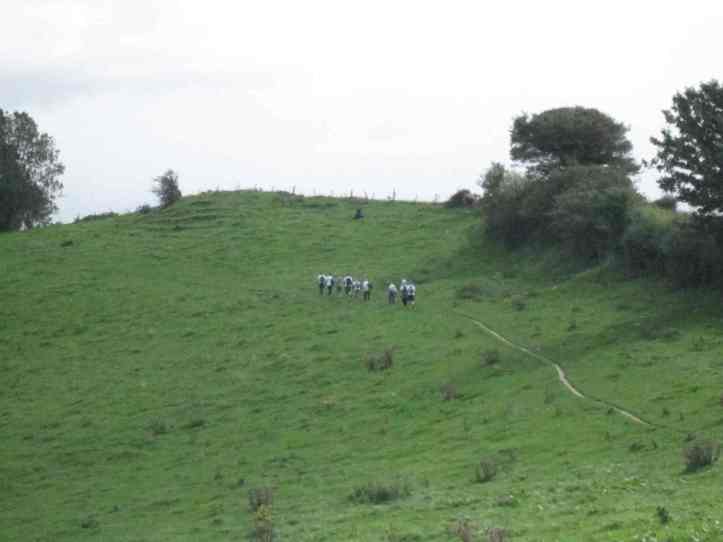 Soon I overtake them (I’m keeping a pretty good pace at this point) and then I spy a group, all in white T-shirts, up ahead. I think I might know who they are. Early in the trip, I met a woman at a point where the trail crosses a road, a natural drop-off point for hikers doing sections. She was looking for her camera, which she thought she had left there the day before when she stopped to adjust her pack. She was wearing a white T-shirt indicating that she is part of a large group doing a charity walk on the Cotswold Way for heart health (Later revision: The Heartful Dodgers is the group—find out more here). Only a few people are doing the whole way, but a lot of people are doing stages of the walk in teams spread out over something like ten days (Later revision: 9, I learn from their website). Spotting these T-shirt, I guessed correctly that I’d found another part of that walk.