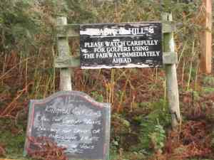 Get out of the way, or stop in and buy something. The upper sign is a warning, the lower offers food at the golf club.