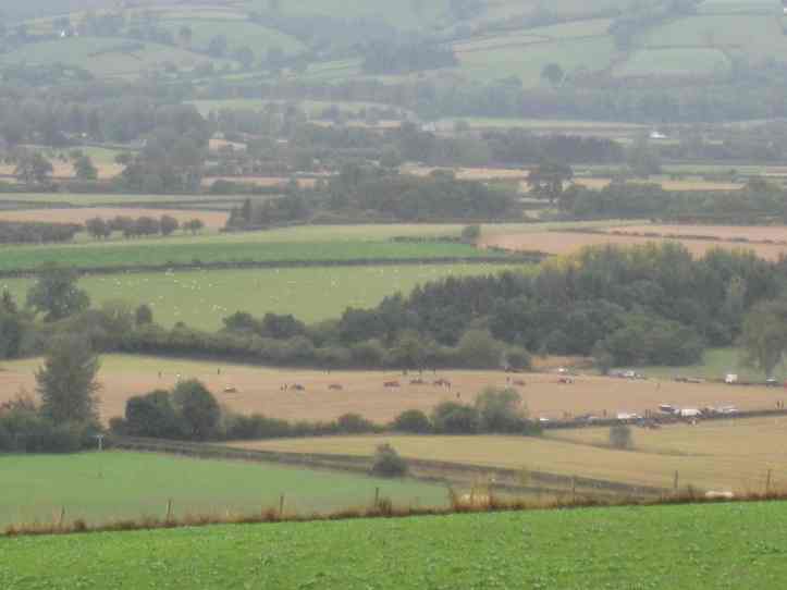 Oh, and during the morning, Sunday you’ll recall, as I came over a hilltop into a valley, I kept hearing what sounded to me like little snippets of amplified speech—a blast of a few words, then nothing for a few minutes, then more. The mystery was solved, partly, when I got to a better viewing angle and in the far distance could see this, some sort of event.