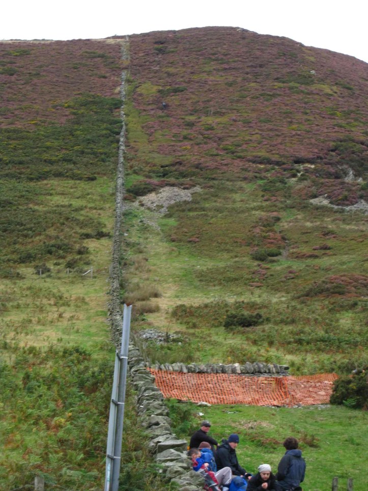 The last big up push goes around a feature called Moel Arthur (moel means a bare hill), which has the remains of a hill fort. There’s an option to go over Moel Arthur and see the raised ground where defenses must have been (not much more remains of these old hill forts—if it’s a ruin of a castle or something, it’s marked differently on the map), but when I saw the sheer bloody-minded up-ness of the endeavor, the drumbeat of completion kept me on the ODP, which still does a fair bit of rising from the base of Moel Arthur, but does that rise to skirt around the side.