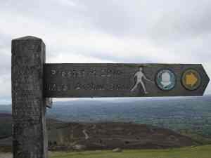 The rise to the Jubilee Tower was my second big up of the day, but it also offered its treats. That’s where I first saw the Irish Sea, and that’s where I saw another sign with mileage (it says Prestatyn 20 miles) to spur me on. From here, the view ahead looks like it must all be downhill to get to the flatlands of the wide valley to the west, which leads like a corridor northward to the sea. But of course, the hills and the path have their own mad logic, so there are in fact tow rounds of steep downs and steep ups before I make a significant descent from the 400-ish meter terrain up here to the low country (and even then, there’s plenty of smaller up and down—a hundred meters up and down is nothing to sneeze at when it is packed into a mile).