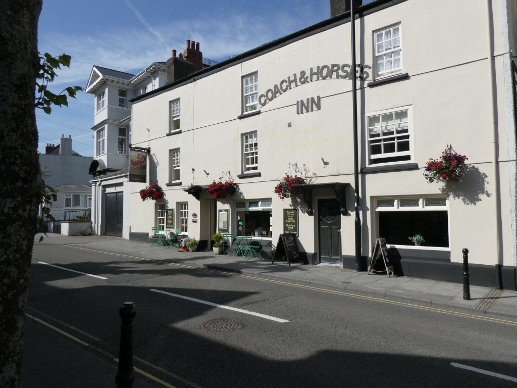The train station is low down by the estuary. The Coach & Horses Inn, my stop, is high up the hill. So, imagine me walking through a lovely Saturday afternoon art fair up the High Street, wearing a backpack and loaded down with a bag that, in my stubborn refusal to buy newfangled wheeled luggage, has to be lugged with a shoulder strap. Much sweating ensued.