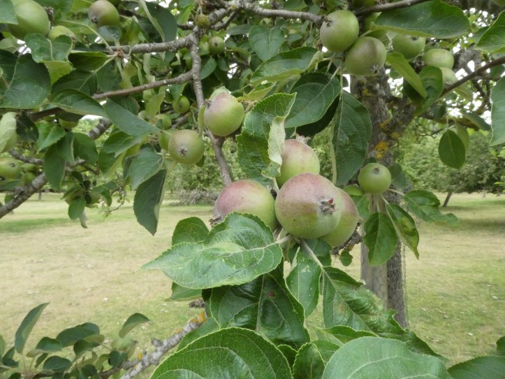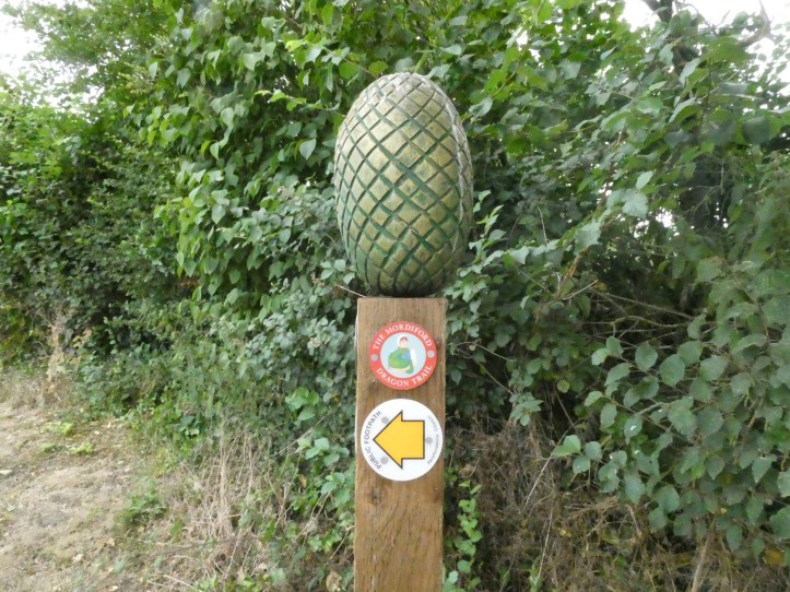 The path regains a very narrow country lane (one car wide, and too narrow for most American bloated SUVs) where I have really arrived in apple orchard country, and also am approaching Mordiford. There’s a fun legend about Mordiford and a dragon. The village was besieged by a dragon hanging out at the river fording point (Mordi-FORD, get it?), and a man condemned to death said he could kill the dragon in exchange for his release. He sealed himself in a barrel and had them put him in the river where the dragon was known to drink. He shot an arrow through the barrel’s bunghole, but the dragon’s expiring breath went into the same hole and killed the man. This legend is captured in a series of funny signs along a section where the Wye Valley Walk shares the path with the Mordiford Dragon Trail, a shorter local tourist path.