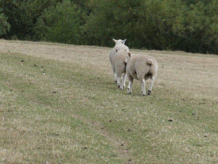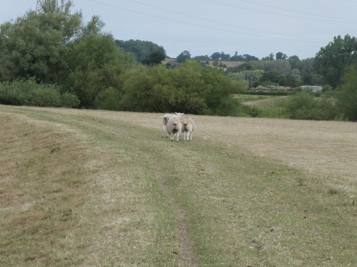 From the very tiny village of Mordiford, the path crosses a bridge over the Lugg (no river fording for walkers, thank you very much), and then climbs onto a long flood bank, where I did unplanned duty as a shepherd to three sheep too dumb to catch that, as I was going along the top of the levee, all they had to do was go left or right off it and I’d get past them. Instead, we did ten minutes of them alternating between matching my pace forward, looking back at me, and breaking into intermittent little dashes ahead, as if by running ten yards they could be rid of me. Eventually, we came to a whole group of their friends, and the wisdom of the crowd led to a mass clearing of the levee so I could pass. For me, after 15 years of encountering them in the landscape. sheep remain hilarious.