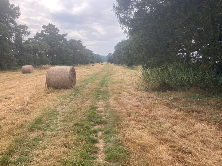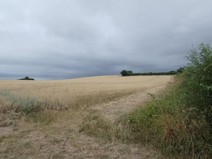 One of the tricky aspects of today’s walk is that the hosts at Dairy House Farm, my stopping point for the night, have stated that rooms are available from 17:00. With only 11.5 miles to walk (though that bit of city walking to regain the trail probably made it more like 12.25, and a few slight diversions brought it up to perhaps 12.5), there was bound to be time to kill. So in the middle of a rather long stretch of road walking along the route of an old Roman road, I stopped for a long lunchbreak at a T-junction where the locals had provided a nice bench in the shade. I also, as sharp eyes will note, made a costume change, because sitting in the shade in a shirt damp with sweat can get a bit chilly.