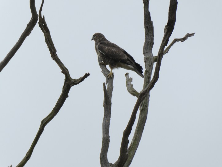 Throughout the day, when passing open fields, especially on the hills, I saw gorgeous predatory birds hovering, looking for a quick snack of field mouse or whatever. I tried to capture them in flight, but I find it very hard to coordinate the use of the zoom lens with my near-sightedness– glasses on to see the bird hovering in the sky, glasses up on my forehead to see in the camera’s screen to try to get that section of sky and zoom, bird is not in the zoomed area, glasses back down to find her again, repeat at comical length. But I did catch one sitting in a tree looking over a field and considering. I think this is a red kite.