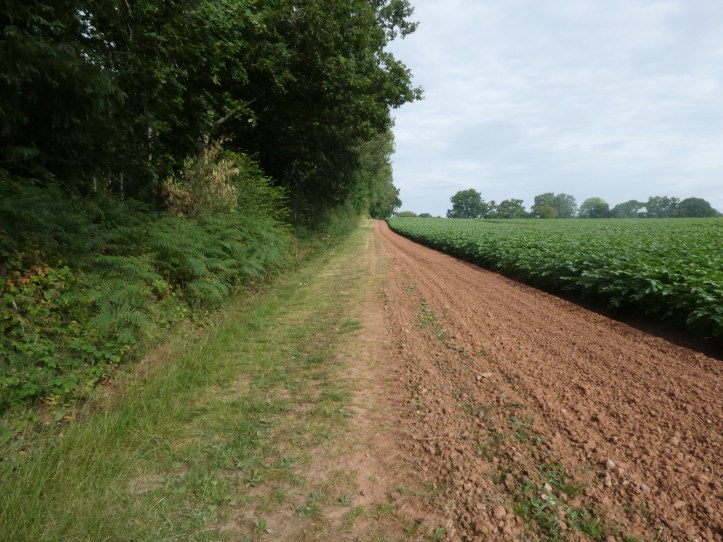 Pigheaded, I went back across the field to the gate, and had the twinge of an idea that when I plunged through ferns and met a T-junction and turned left, I should have turned right. So back I went. Sure enough, about twenty yards beyond that T-junction, I found a sign for the Wye Valley Way AND the Herefordshire Way. And then the path turned downhill.