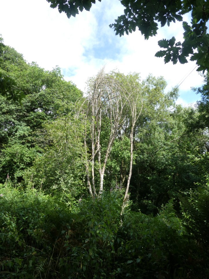 The path did some down, and then a bit more up (big surprise)and regained a paved road. Here’s a not especially good photograph of another one of life’s riddles: Did the tree grow this way naturally, or did humans intervene to weave the tops together, and if so, why?