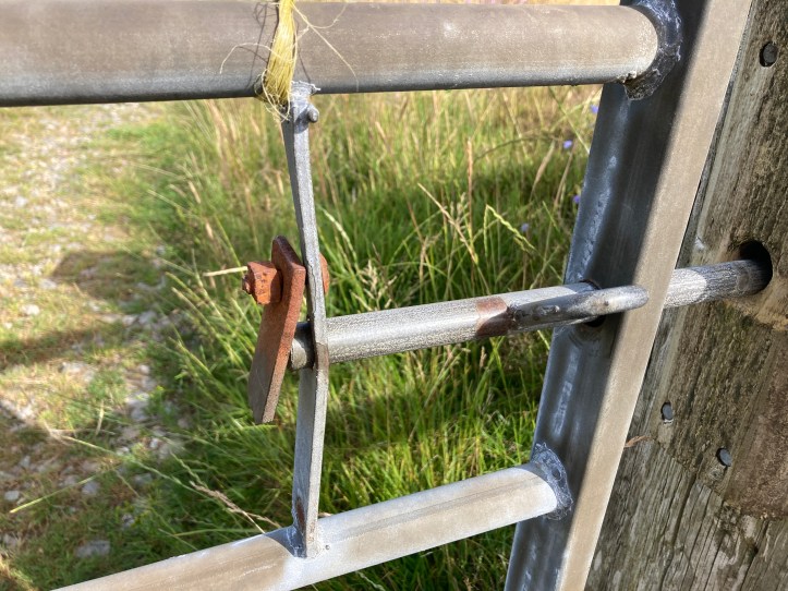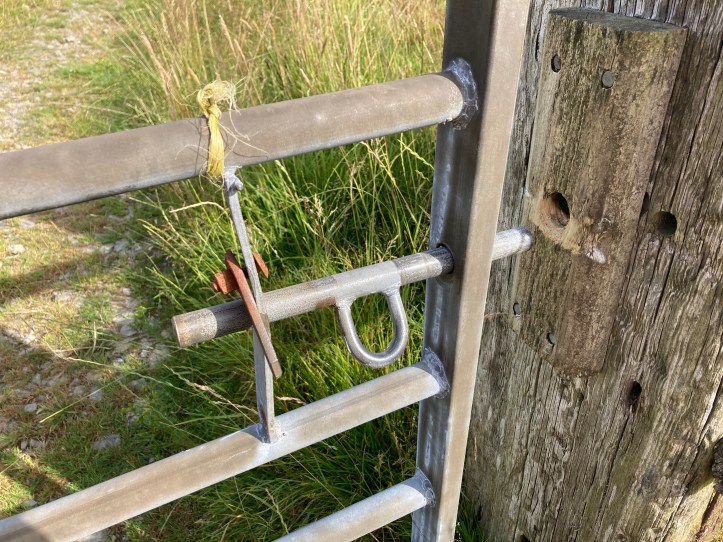 Just imagine that moment when an ambitious flock of sheep, tired of grazing in this field and ready to see the world, have somehow used their tongues to flip that cover, done some fancy back-kick to move the handle into the sideways position so the notch in the bolt passes through the hole, gripped it in their teeth to pull the bolt free of the gatepost hole, and pushed open the gate. “Well, Charlie, what do we do now?” asks one sheep of another. “Well,” Charlie replies, “there’s some grass over there.”