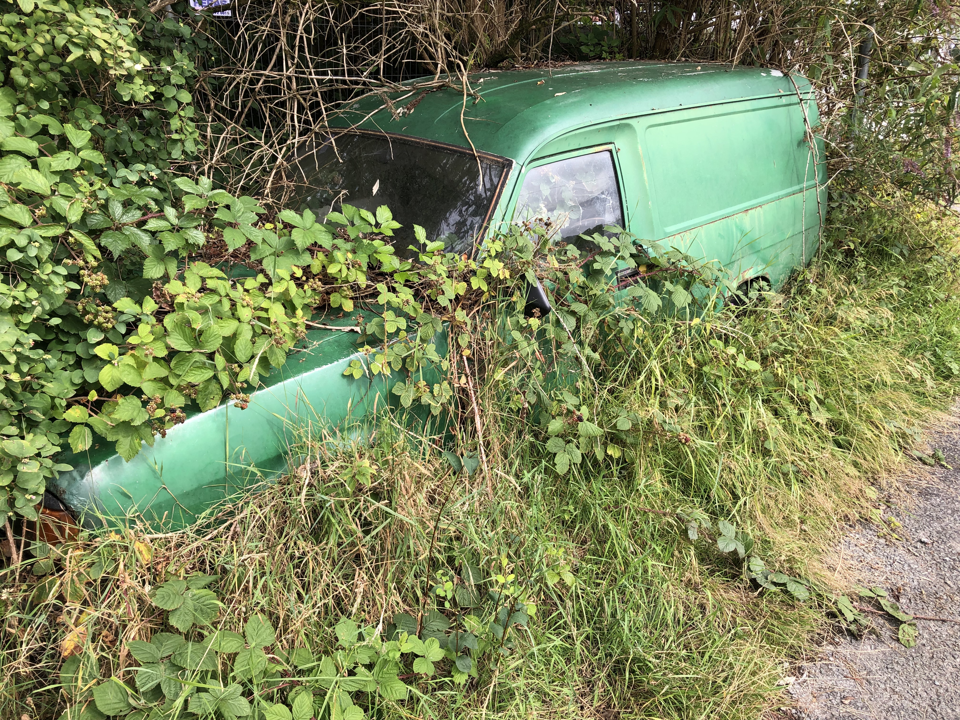 And in some cases the speculation is just fun. What the heck happened that someone abandoned this little van right near some houses, and it just stayed there long enough for weeds to grow up inside the van?