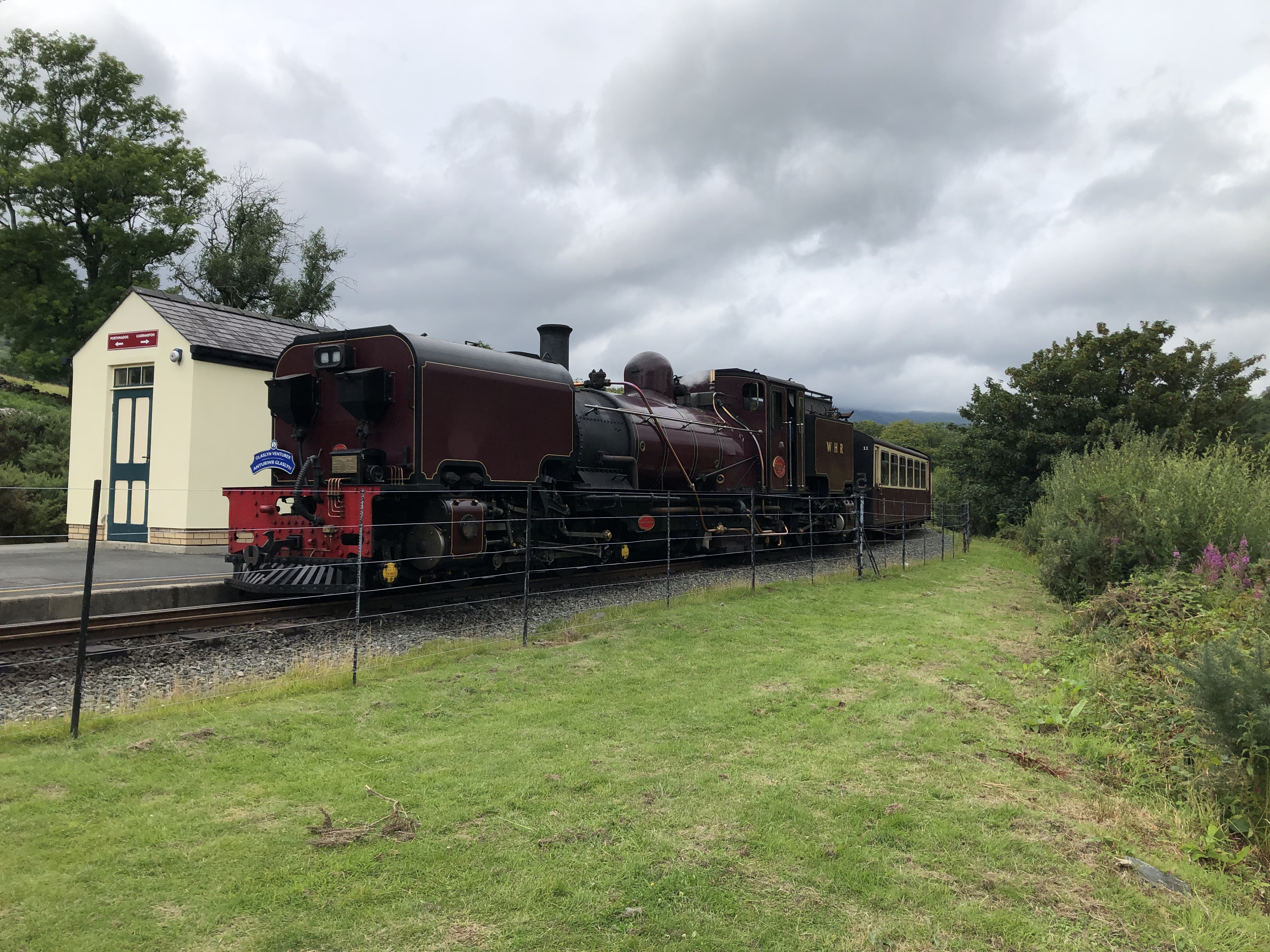 The last five miles were on a lovely gravel path where we passed a herd of kids on bicycles (maybe 30 all told) supervised by four or five adults. Then we wove our way down to Beddgelert, passing over small-gauge railroad tracks a number of times as we zigzagged down. And right before town, we saw a train at a station.