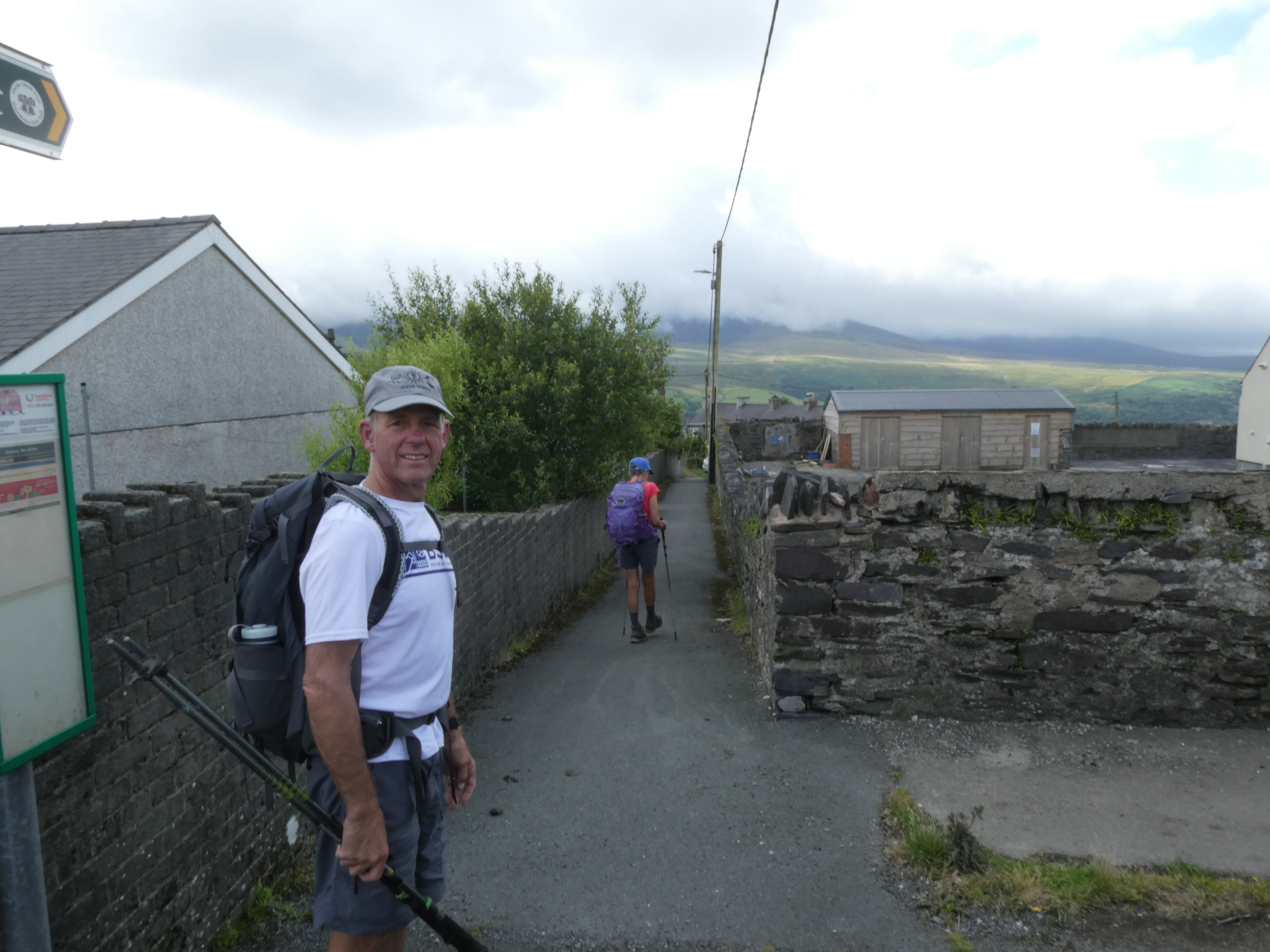 So, I’ll summaraize the day, and you can imagine the three of us shifting among these conversational modes as we go. We were, you will recall from yesterday, staying in a fancy hotel in Caernarfon. We needed a taxi pickup. We were gunning for the early side (8:30) but when I called from the hotel in the evening to set up the morning pickup, they were a bit flustered, because they’d assumed 9:30, which is what people mostly want. She told me she’d try to get the driver to do his first pieces of driving (the taxis are also hauling luggage and doing heaven knows what– delivering food orders for all I know) quickly and he might get to us between 9 and 9:30. Which of course meant he arrived at 9:45, and we got dropped back at our trail later than I would have liked, But he was an interesting guy, and helped us understand the extent to which many Welsh really aren’t good at English. He was, but he said most of his friends couldn’t carry on a conversation in English. The Welsh animosity for the English runs deep, and has persisted over centuries.