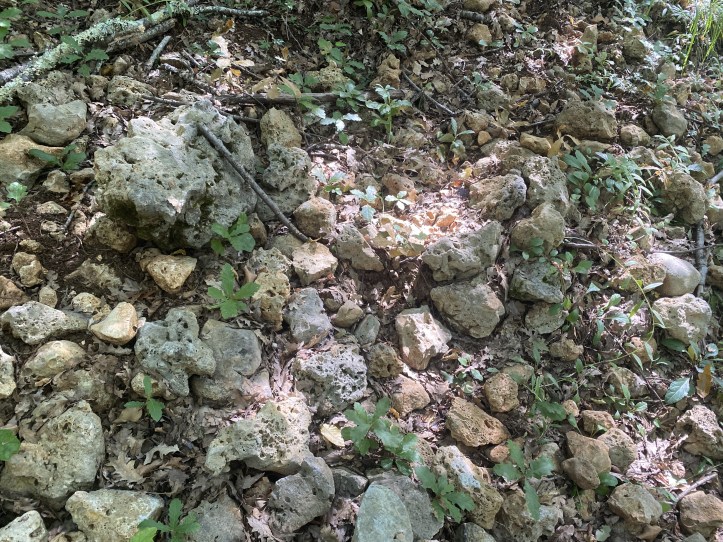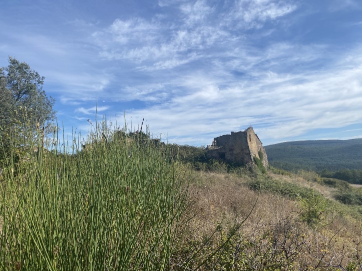 After shedding a huge amount of elevation, we got out of the forest (based on the chain-link fence along one side for several miles, we think it’s a forest preserve or perhaps an ecological research area) and arrived at cultivated land. Rather mysteriously, the big flies that had been hovering for a good solid hour or more disappeared. Yesterday there were cultivated field and plenty of the flies, so I am not sure that it’s a case of the vineyards and olive groves discouraging flies. As has always been the case on my walks, I am humbled by my ignorance. When are olives picked? Something to Google when I am done writing.
