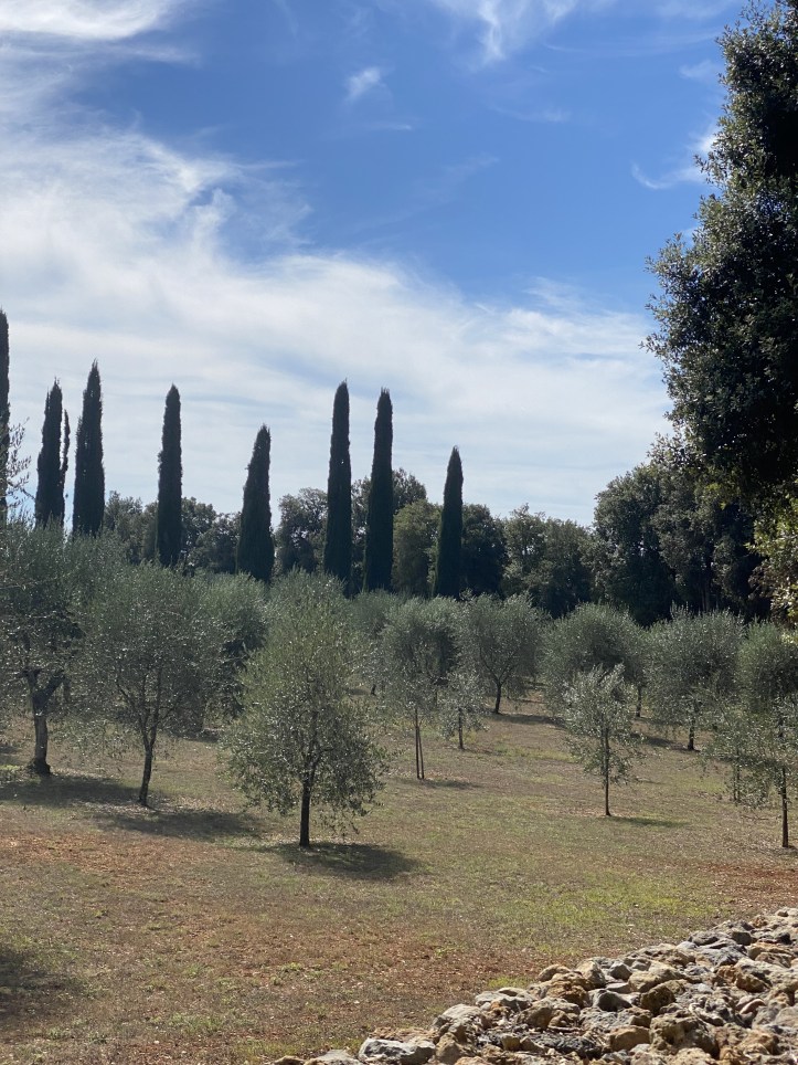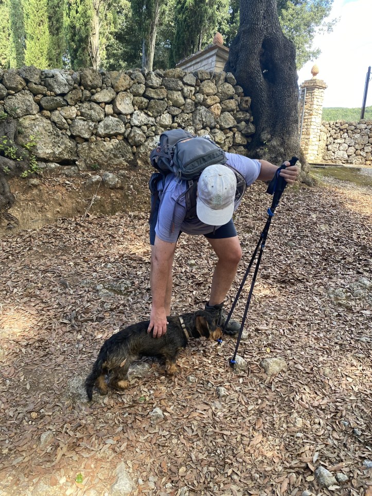 At the gate of the first wine and olive oil farm/lunch/shop, we heard the most charming little woof of hello from this low-to-the-ground little dog, who came out to say hello, but in the most polite ‘Is it okay to sniff your boots?’ way. It was okay, and he was delighted to be offered a hand to lick. Mission accomplished, he happily trotted back through the gateway.