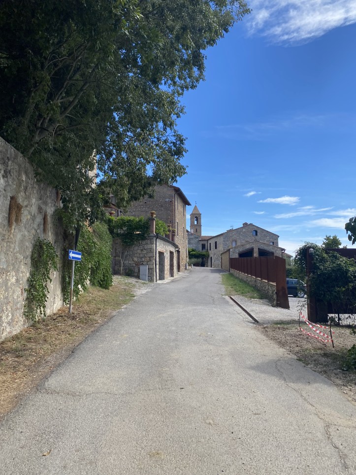 The little vineyards certainly must do a thriving business in wine and oil tastings– we passed several just on our route. The day was offering a whole different look and feel from yesterday. Yesterday was parched, with lots of dry fields churned to expose unplanted soil. Tans and browns with little patches of green in the bottoms of small valleys. Today was a mix of forest and agriculture. The first one was a full-on vineyard, but after our lunch pause, we came across a place making wine from the grapes from surrounding farmers in a tiny tiny village. You could, of course, also get a nice lunch. The whole village seemed to exist to support a little restaurant and wine shop. The clinking of forks and knives as we went by did not lure (I tend not to get hungry while I am walking, and have to kind of work to make myself get enough calories on the trail), but served as a nice reminder of the promise of another good dinner one we reached San Gimignano.