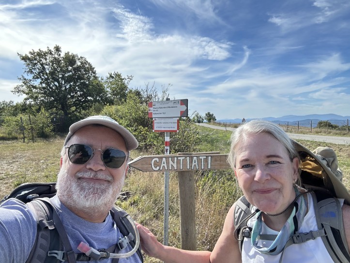I’m not one to be defeated by a little exhaustion and a firm reminder of my limits. But I’m also not in this to drive myself to exhaustion. After getting blasted by the sun yesterday, we agreed to trim a bit off the front end of today’s hike by taking advantage of a suggested drop-off further along the route. We were going to cut off about 4km, but when our driver suggested at that spot that he could take us about another kilometer along to a spot where the path made a dramatic turn (he had to go that way anyway), we embraced his suggestion. Here we are at the signpost aiming us down a gravel path to Cantiati, ready to start our day of roughly 11 miles.