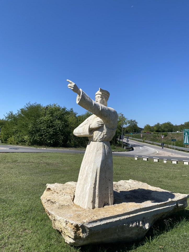 At this point, we had about two hours to kill before the bus to Siena down at the bottom of the hill, so we bought sodas and found a little park not on the main drag (the ‘village’ has two very narrow side streets off to one side of the main shopping/tourism drag) and idled for a while. When we could stretch this out no longer, we headed down the hill (multo steep!) and ended up killing another 30 minutes or so before catching our bus at this rather vividly statued roundabout.