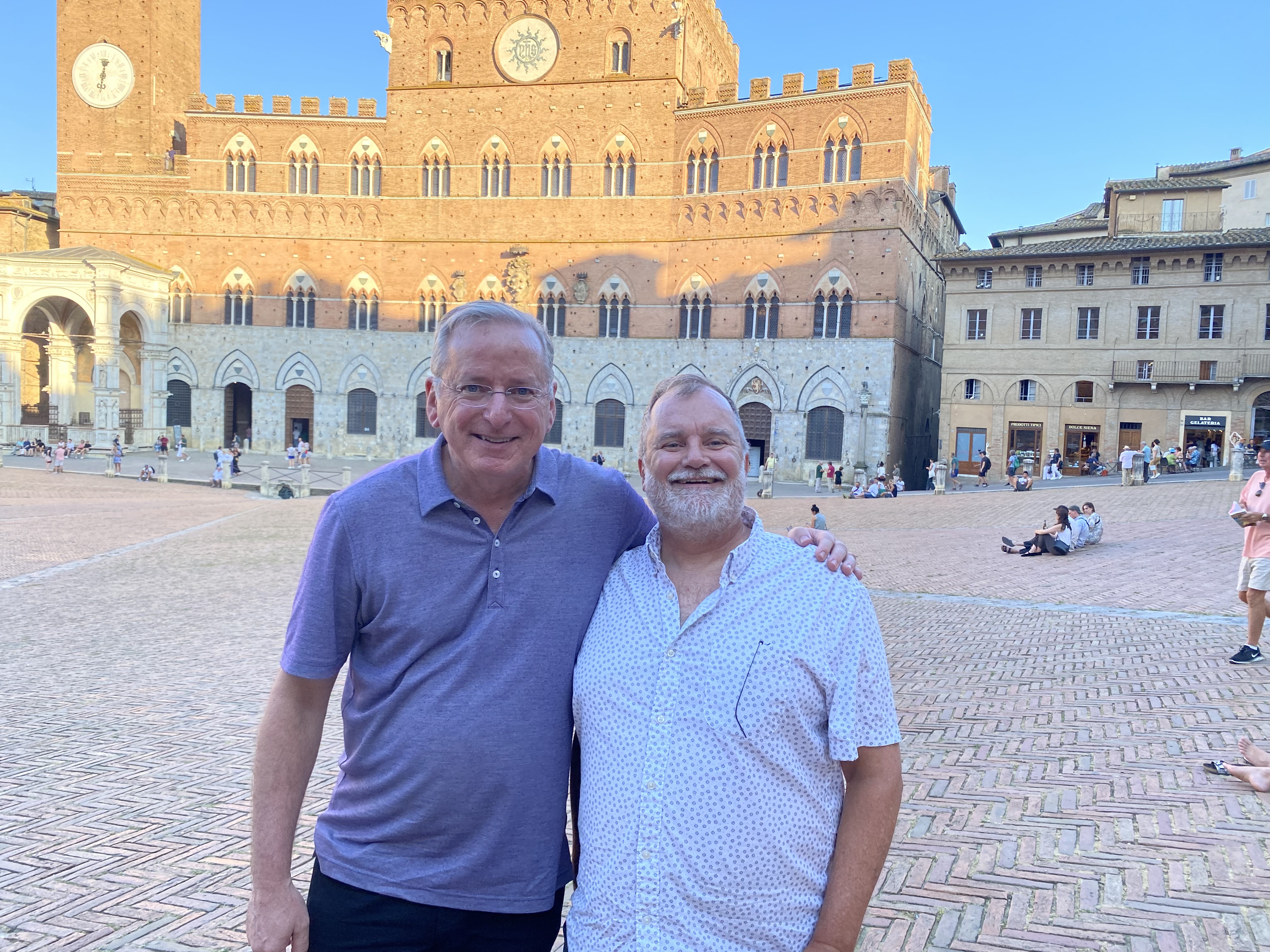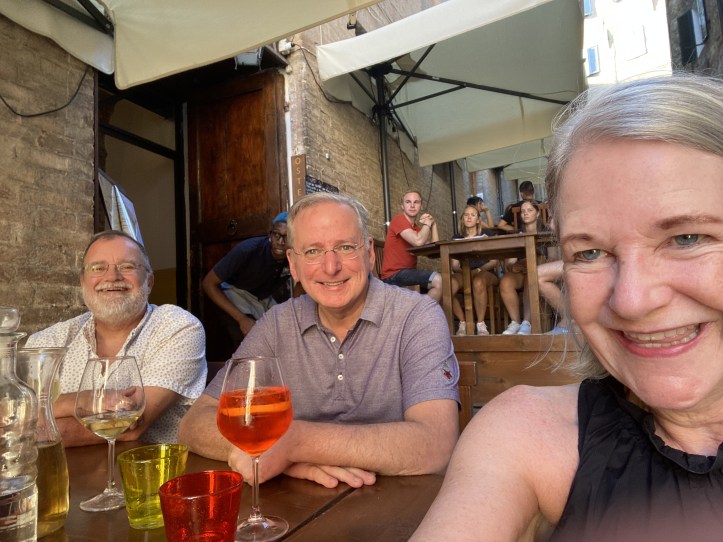 The bus ride was straightforward, and in thirty or forty minutes we were in Siena, where we would have all of Friday to see the sites. And Karen’s husband Tim was arriving soon after we were, so late in the afternoon, we did a first round of tourism by visiting Siena’s famous piazza where the Palio, a horse race in which riders from the city’s contrade, or city wards, ride at breakneck speed around the piazza while massive crowds go wild.