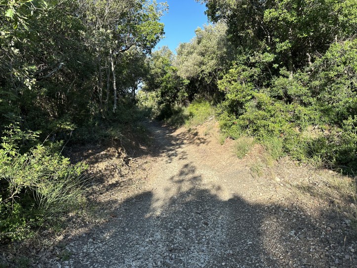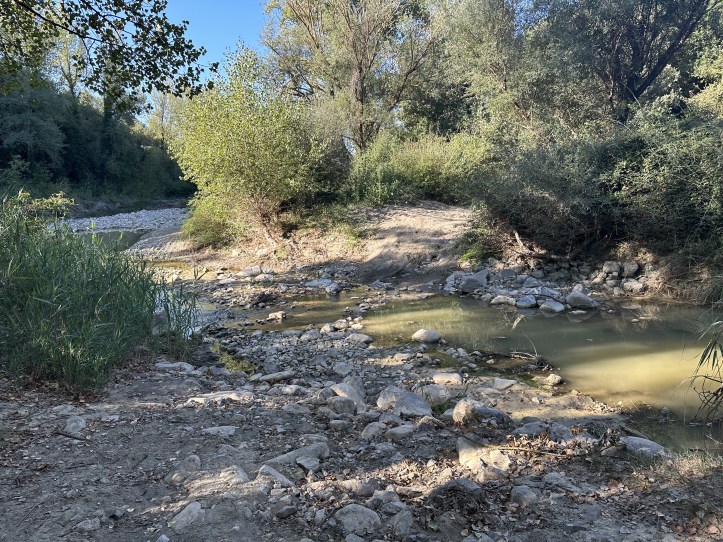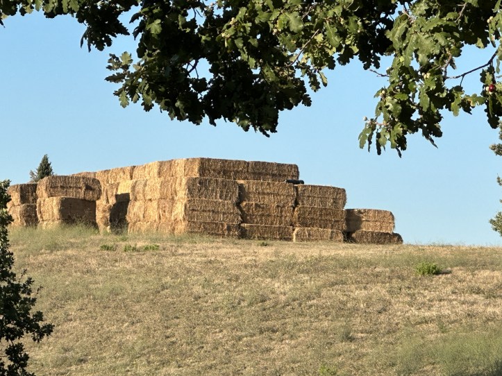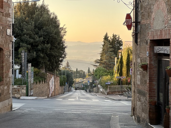 This was the kind of day I wanted for every day of this trip. Things just went my way. It started with the convenient fact that my B&B in San Quirico is not staffed on-site. The B&B has a shared kitchen/eating space, but the host has left yogurt and makings for coffee in the fridge, and said when I checked in that he would bring bread at 7:30. But it occurred to me: why wait? With cereal and yogurt available, I could start my day extra early to get the jump on the walk and beat, or at least limit the exposure to, the heat.