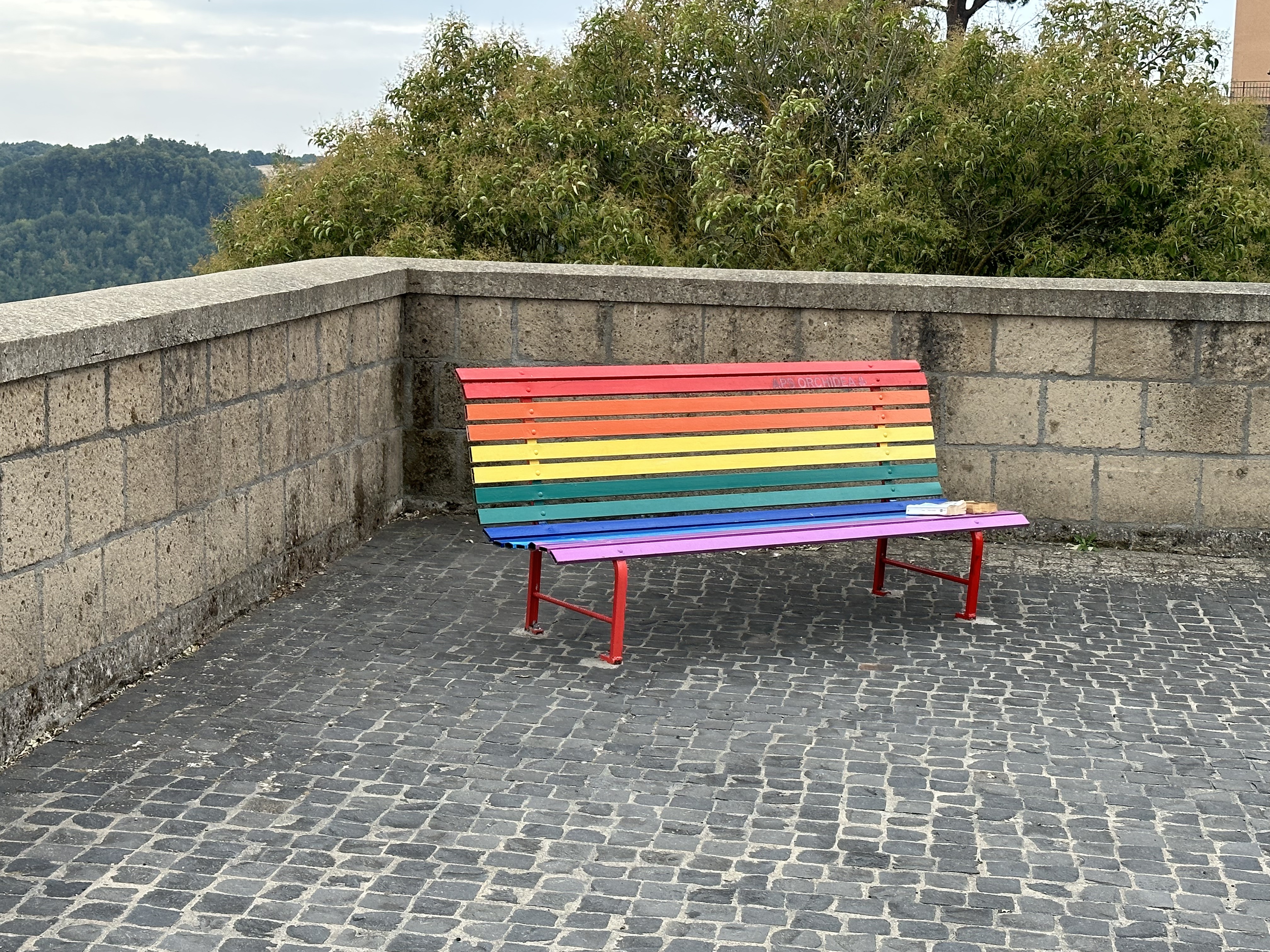 But today, after three days of goofing off and walking a total of 8 miles over three days (that’s just nothing), I put in what the trail guide suggests was about 11.5 miles, and what my iPhone Health app says was 13.8. Let’s call it 12.5. And let’s celebrate with a random photo of an unexpected rainbow bench in Proceno.