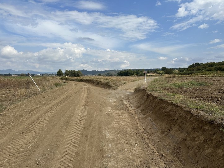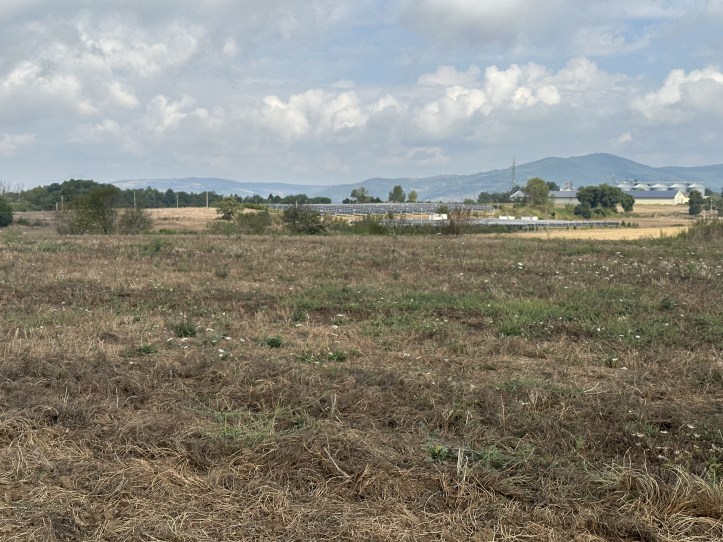 That brought me to the third, longest phase of the day’s walk. I’d gone perhaps four miles, and now I had seven left to go, but the landscape was transformed. It was flatter and made up of huge fields, some in cultivation, others given over to solar farms. The dirt road had some gentle roll, but it was mostly a long walk that could have been Kansas if not for the hills in the distance.