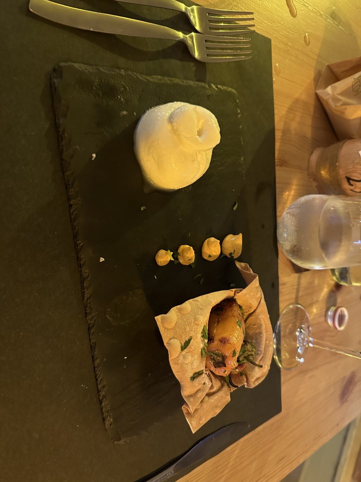 I started with Burratina con cestino di peperoni snack alla brace, which as you can see from the photo below is a ball of creamy burrata with little roasted peppers served in a little toasted edible basket.