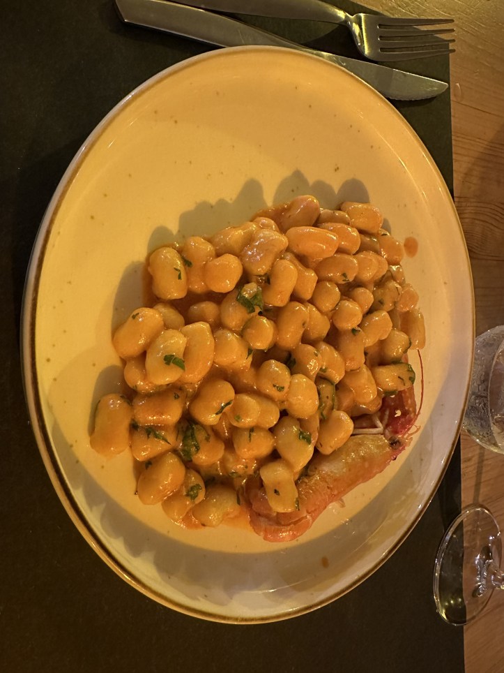 In the spirit of the lakeside, I had gnocchetti alla nostra crema di scampi, which translates as little gnocchi with a creamy sauce of shrimp. I’m not 100% sure, but I think this was actually freshwater crawfish. I couldn’t think how to ask with my limited Italian. Whatever it was, it was delicious.