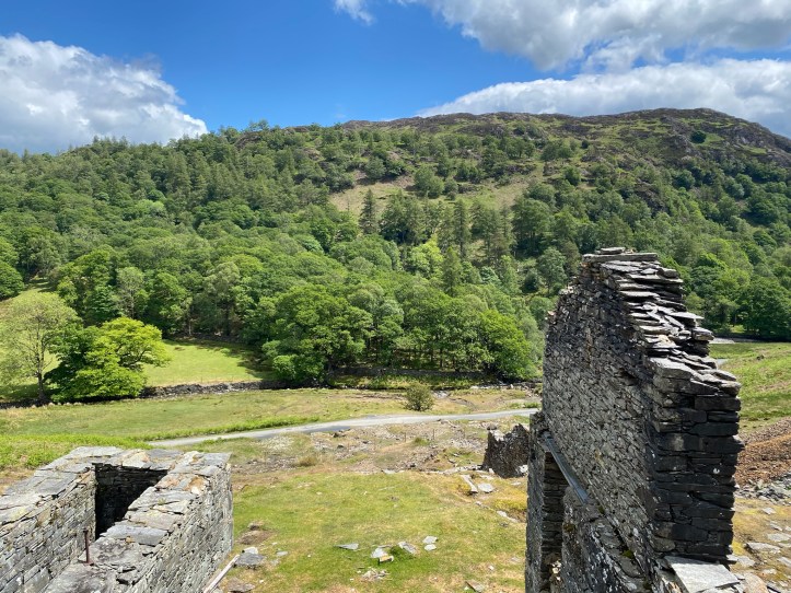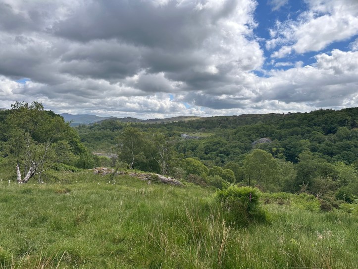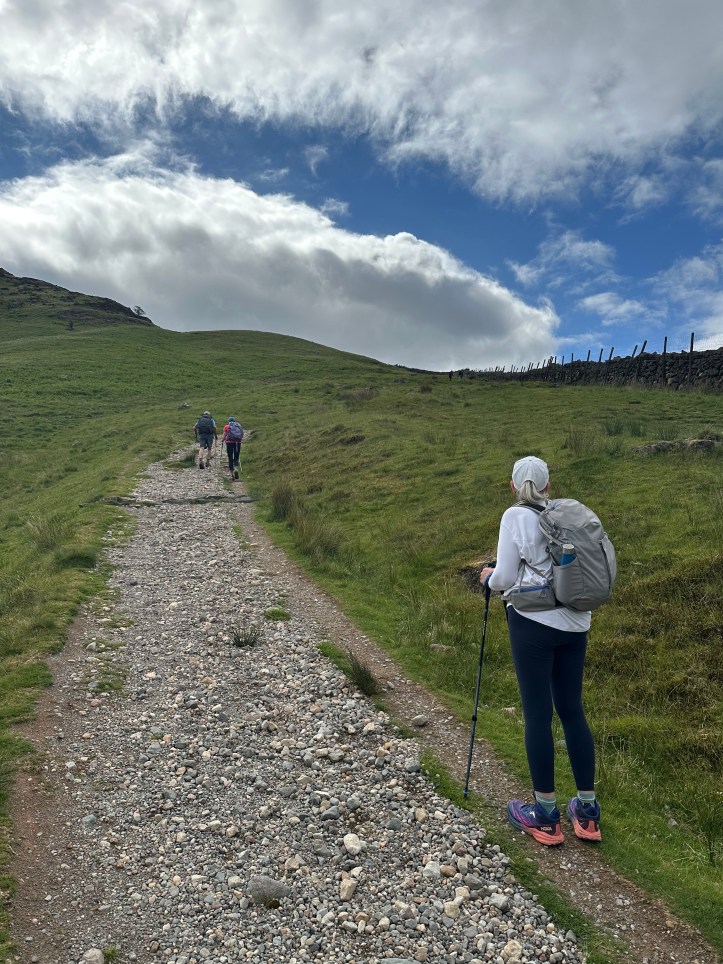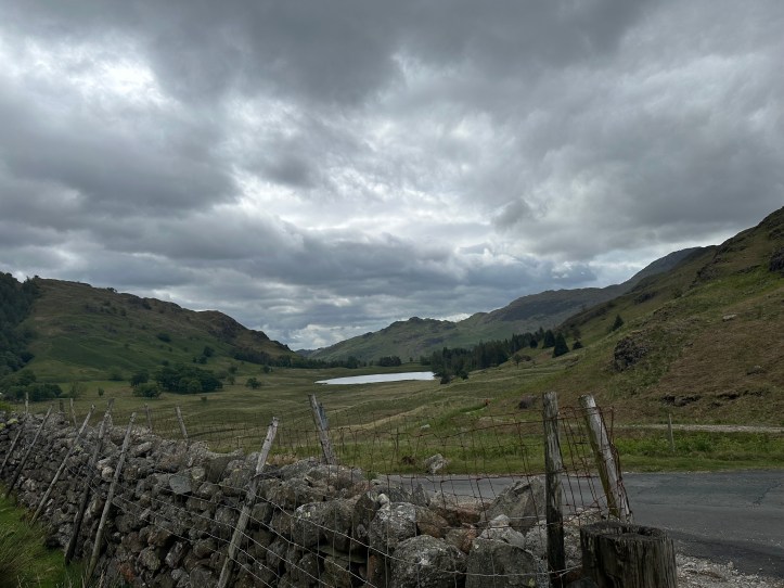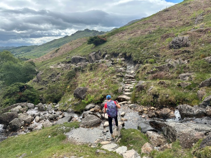 It started with one of the demanding bits. With a short walk and today’s accommodation noting a 4pm check-in time, we left the Old Dungeon Ghyll Hotel around 9:45am. After crossing the river through this little valley and passing through a campground, the most intense up of the day began. After winding up through a little bit of forest, it came out into the open hillside with a gradient that’s just about like climbing flights of stairs. Like, say, dozens of flights of stairs.