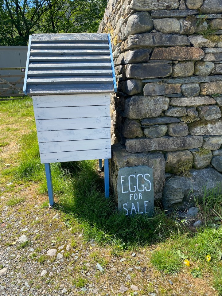 In the second valley of the day, we passed through a farmyard with an ‘eggs for sale’ box. This one has a novel artistic surprise: there’s a cutout hole shaped like a chicken through which you access the eggs.