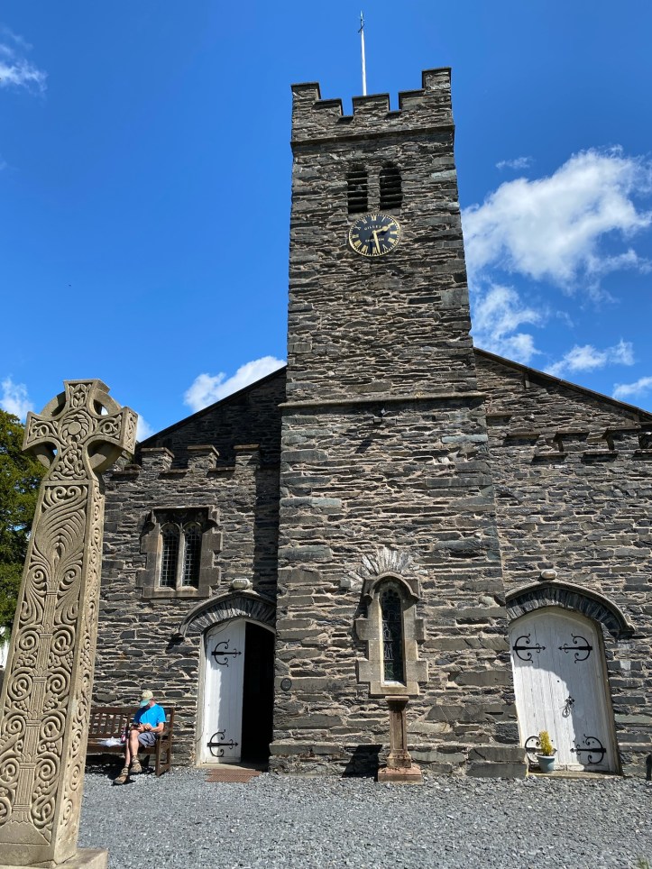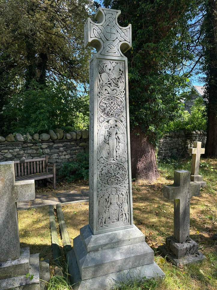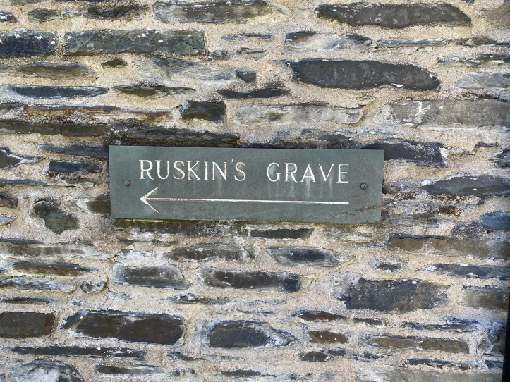 From here, the path followed the paved road down for a while until joining a bigger road, where there was, thank heavens. a separate footpath through the woods on the hilly side of the road. We made our way into Coniston. With time to kill, we sat in the churchyard where John Ruskin is buried. Oh, wow, I hear you all saying, John Ruskin’s grave! Or maybe you’re saying John Ruskin?