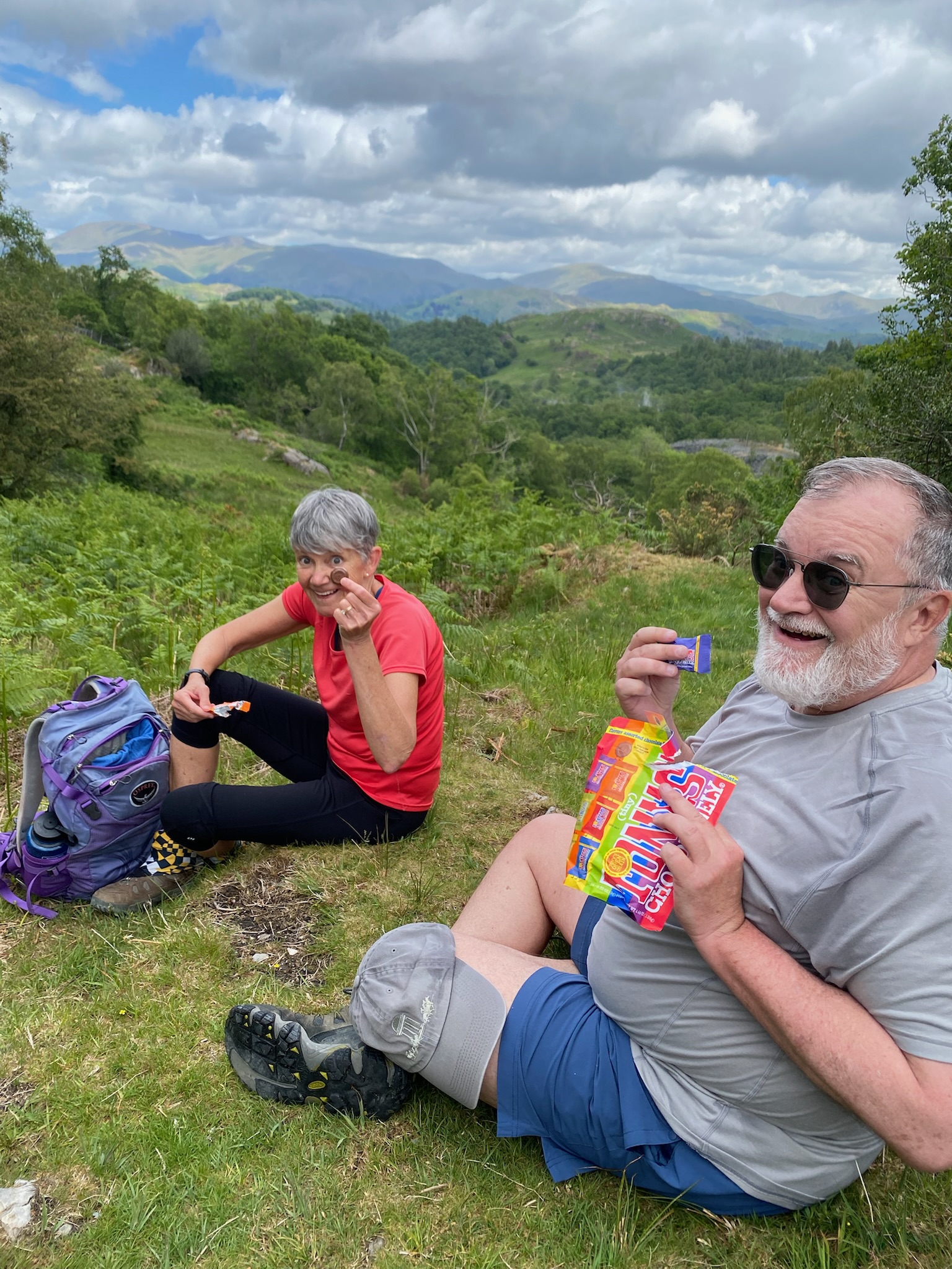I knew from the route elevation profile that this was the last big ascent, and so after we’d summited and were hiking along an undulating but straightforward section, I suggested a halt. It was perfect. We found a grassy bit, unspoiled by sheep shit, and sat down. Karen had cleverly packed some of the most delicious chocolate known to man, in a mouth-watering variety, packaged in a perfect one-bite size.