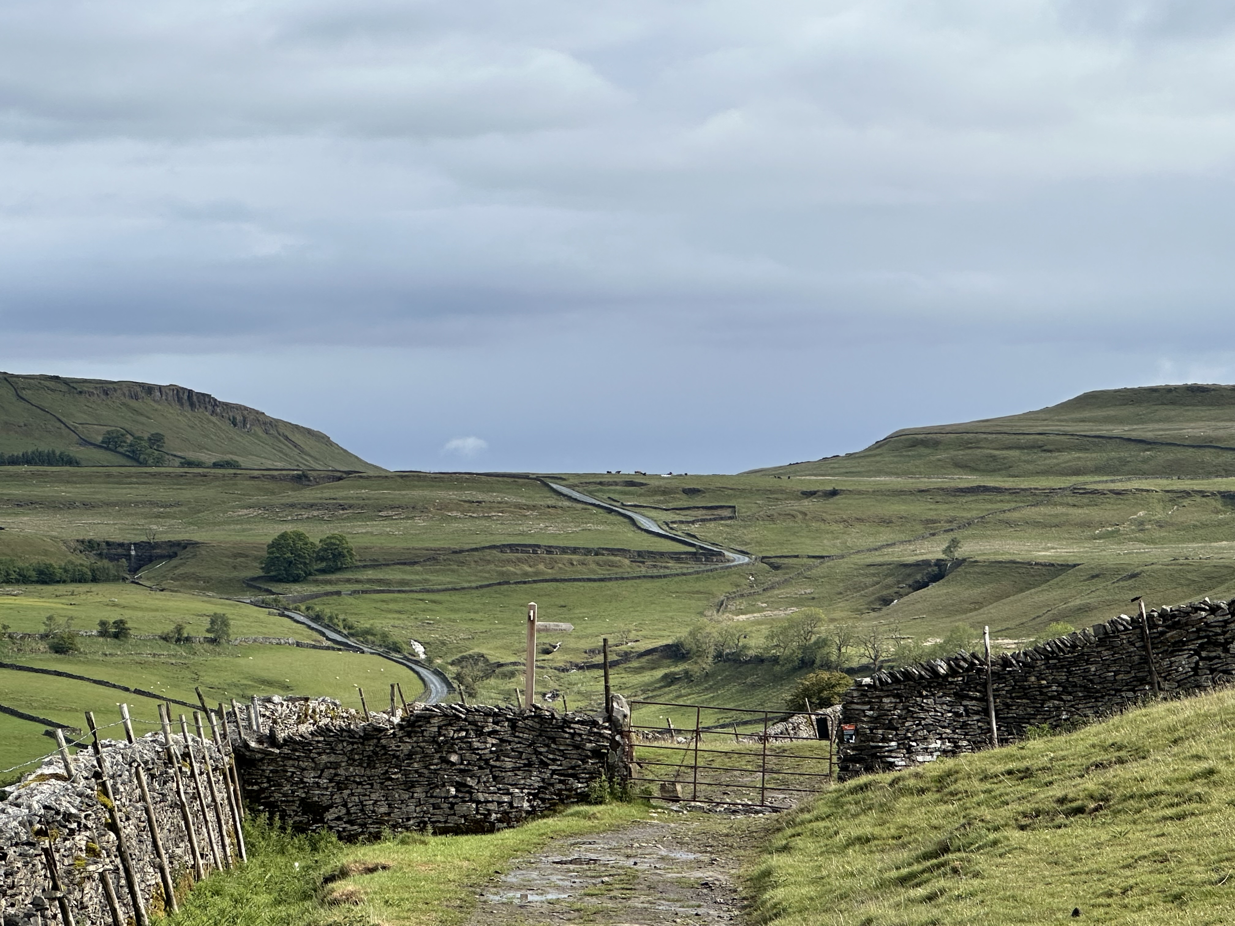 The forecast was mixed, and it had been raining and then drizzling since I awoke. The temperature was a bit lower than yesterday (50 degrees), and I was ready for some wet chilly hiking. But I heat up fast when I am moving. So off I went. Buckden is very small (one street essentially, with a few lanes shooting off with houses), and the instant the path left town it began a persistent rise. It was invigorating, and I started breathing with an audible rhythm on each exhalation, but I found a good pace and headed up. And up.