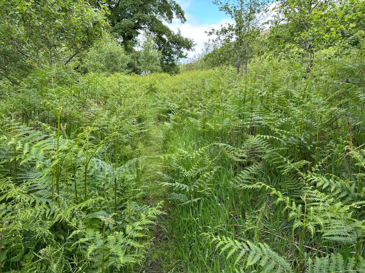 But onward. Chat with two farmers and their dogs, trying to explain why it’s nice to get out of the big city of Chicago to walk in the country, while they both looked dubious but in a nice way. Then up the hillside a bit to follow a meandering path through the undergrowth, including a long section of my nemeses, ferns (for the new followers, please see the 2022 post, Ferns and Loathing).