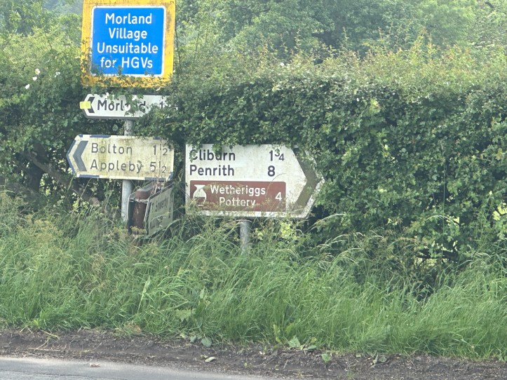 Let me gripe a bit. Here’s another thing that can be frustrating: when you have a taxi pickup at the end of the day because the trail segments are broken up at places with no accommodations. I get it. Contours wants to give you good walking distances, and so for instance, it makes sense to end today at Cliburn (pronounced to rhyme with crib -burn, not the way we pronounce Clybourn in Chicago, as I learned when I stopped at the tiny village shop in Kirkby Thore for refreshment and got chatting with the woman who sold me my fizzy drink).