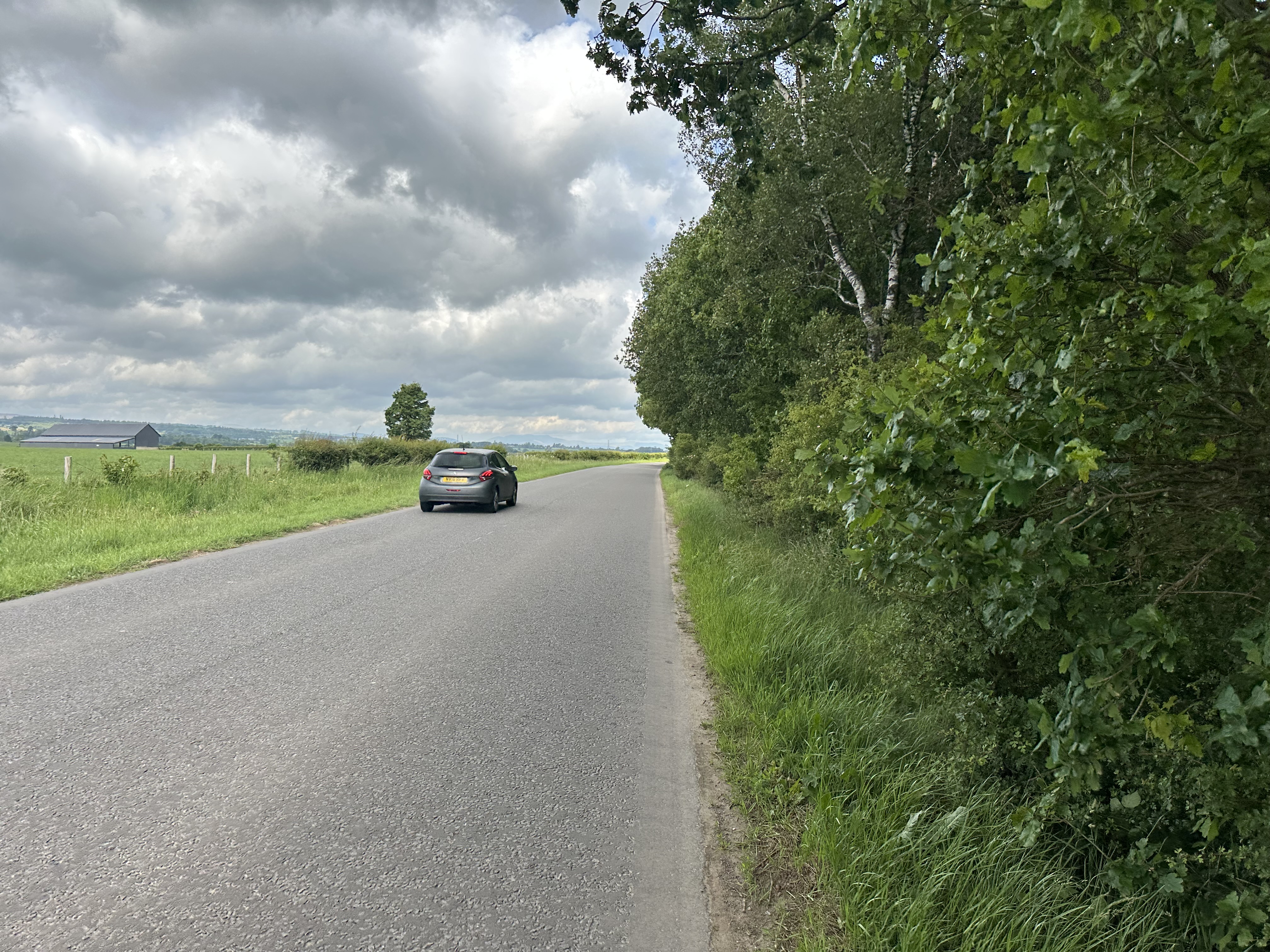 After dipping down toward a stream and getting across a few fields and back up to a road, the pavement era began.